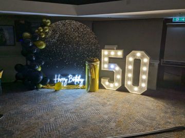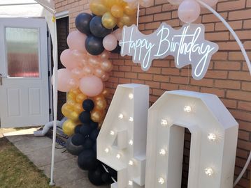 Back drop with a choice of your ballonand a light up happy birthday sign